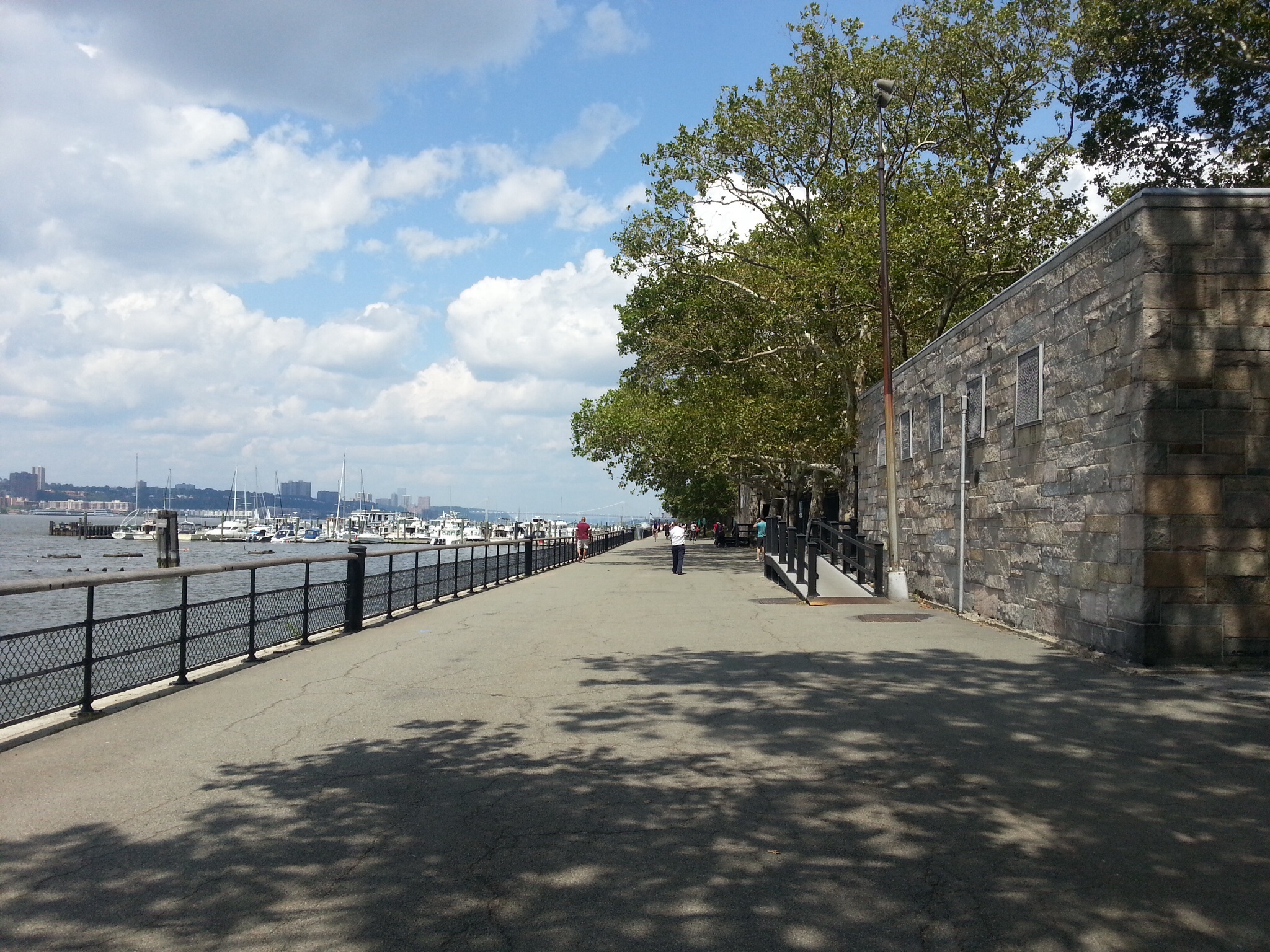 I admit the ‘bitch’ addition was from a car driver, but the start of the comment was made several times by our fellow bicyclists*. Dutch inspired style cycle lanes don’t necessarily create Dutch style riding, it turns out. For me cycling is more than a method of getting somewhere quickly and conveniently. It’s an opportunity to chat to a companion, enjoy the scenery and sometimes stop and take a photo. Unfortunately it seems that quite a few New Yorkers aren’t of the same disposition and were somewhat frustrated by our pootling side by side. Some of this frustration is caused by the peculiarly narrow cycle lanes themselves; someone in the public works department needs to get their ruler checked before too many more of these get painted. Conflict between cyclists and pedestrians should be designed out and a thick white line just doesn’t do the job required here. Neither does the bidirectional path, which wasn’t working out well for the poor annoyed people held up by two chattering women standing around taking photos.